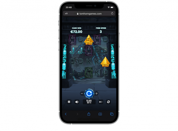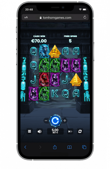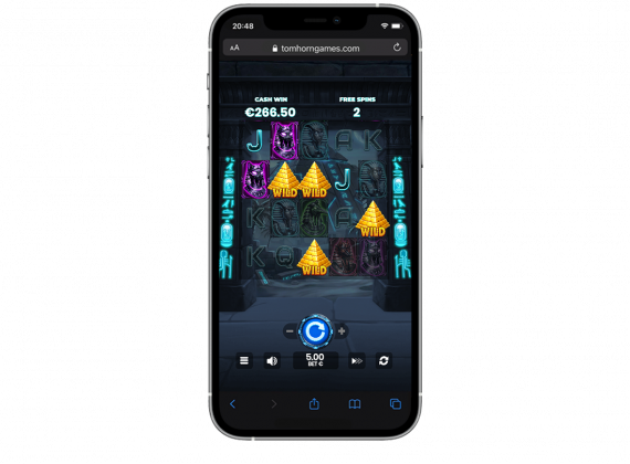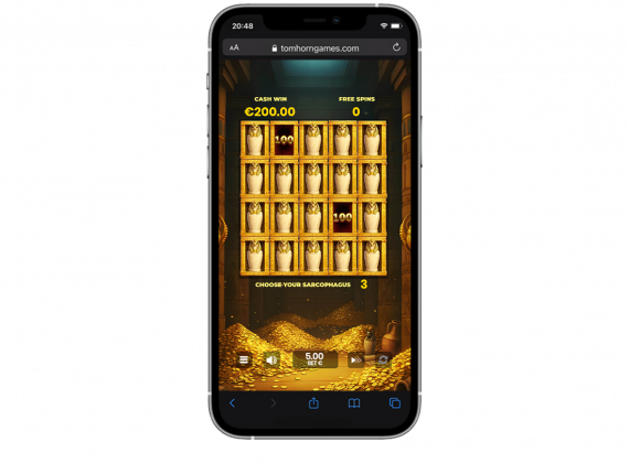 3, 4 or 5 SCATTER symbols trigger the Tomb Pick-Up Bonus feature, unlocking 12, 16, or 20 sarcophagus boxes, respectively. Player has 3, 4, or 5 picks to choose from, depending on how many SCATTER symbols triggered the feature. Sarcophagus boxes contain Cash Prizes and Free Spins, which are summed in cash win and Free Spins count boxes. Up to 15 Free Spins can be awarded.