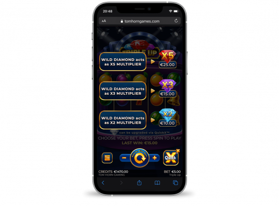 QuickX™ guarantees WILD DIAMOND acts as a multiplier x2 or x3 or x5. There are 3 options: